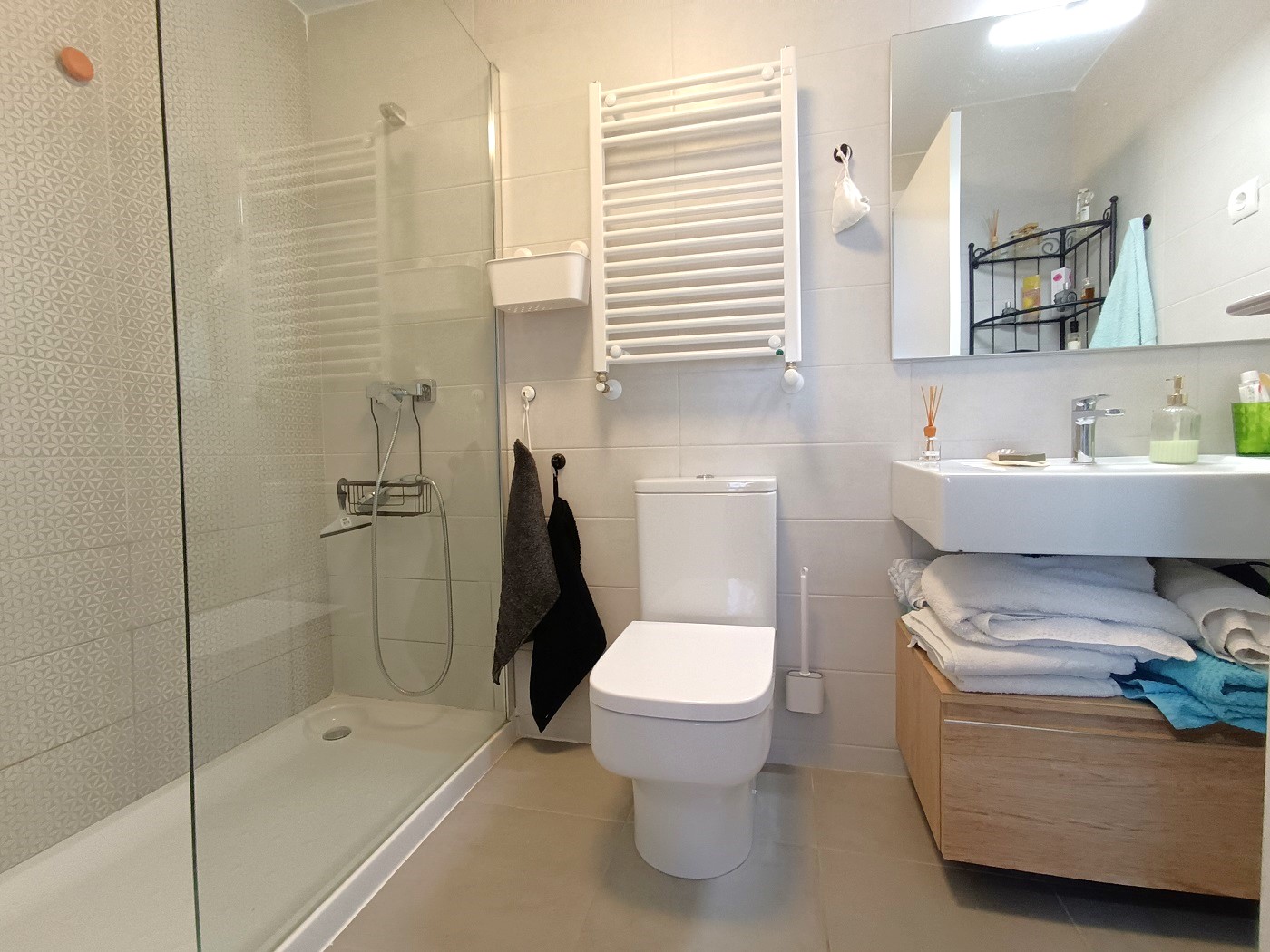 La vivienda se distribuye en un amplio y acogedor hall de entrada, una cocina independiente con salida directa a la terraza, y un luminoso salón también con acceso a la terraza, desde donde se disfrutan despejadas vistas a la zona verde. Cuenta con dos dormitorios con armarios empotrados y dos baños completos: uno en suite en el dormitorio principal con ducha y otro baño de servicio.